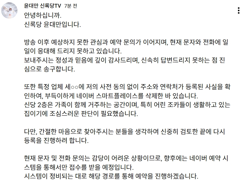 📢 윤대만 신록당 공식 공지 (예약 방식 변경 안내)